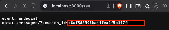 HTTP 로 테스트할 수 있으며, 이를 위해선 먼저 세션ID 값을 받아야 합니다. 인터넷 브라우저에서 주소창에 <MCP가 실행되는 IP>:<MCP Port>/sse 를 입력하면 세션 ID를 확인할 수 있습니다.