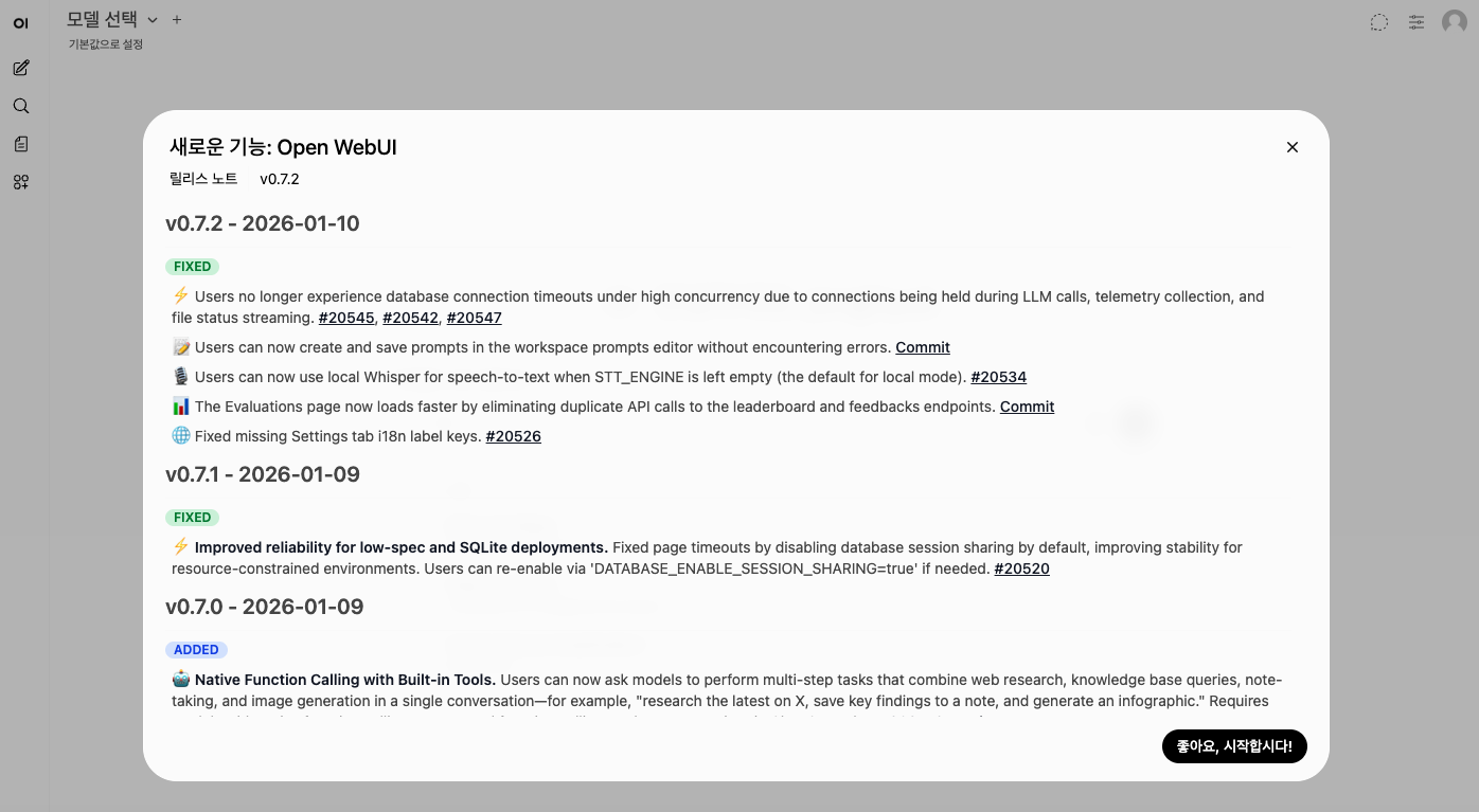 - 작동 방식: Ollama가 ‘엔진’ 역할을 하여 LLM을 로컬에서 띄우고, Open WebUI는 그 결과를 화면에 보여주는 역할을 합니다.