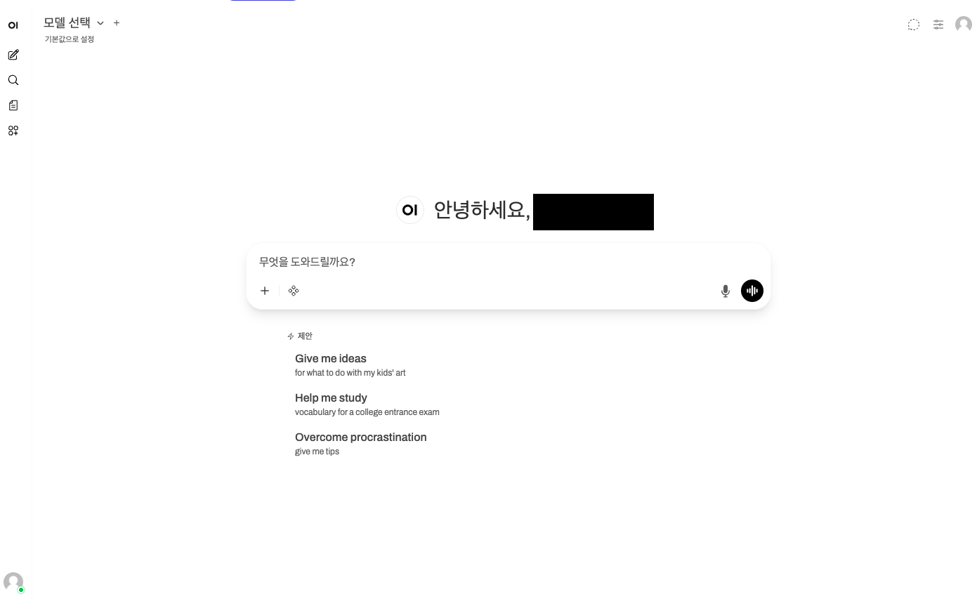 - 공지를 닫으면 ChatGPT 와 같은 대화 UI 를 볼 수 있습니다.