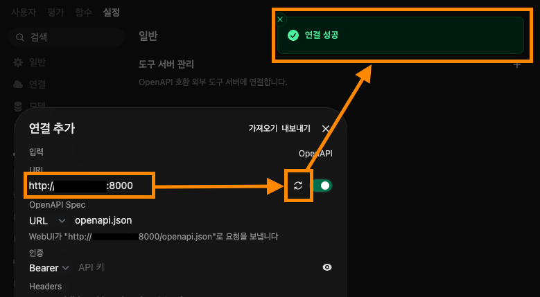 - 팝업 창에 MCP 서버 URL을 입력하고, 새로고침 버튼을 누릅니다. 성공적으로 연결되었다면 화면 우측 상단에 “연결 성공” 메세지가 뜨는 걸 볼 수 있습니다.