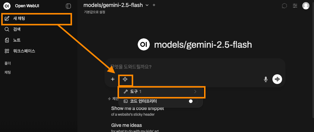 - 다시 새 채팅으로 가봅니다. 여기서 통합 버튼(마름모 네개)을 누르고, 도구를 누릅니다.