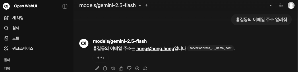 - 예시로 주소록 MCP 에 홍길동의 이메일 주소를 물어봤습니다. 출처가 server로 나오며, MCP 서버의 응답에 기반한 답변이라는 것을 알 수 있습니다.