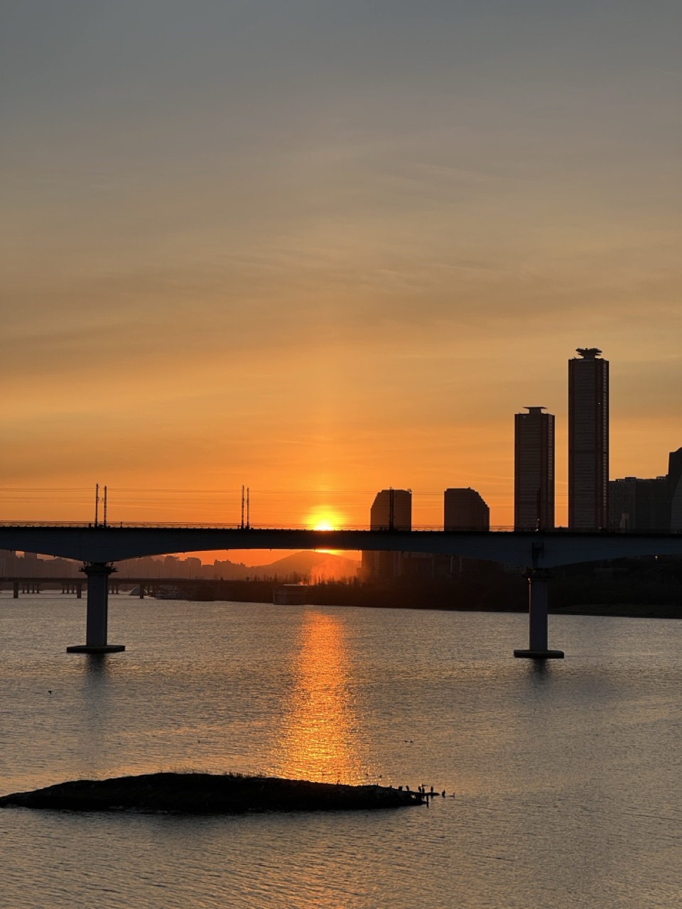 해가 다리 아래로 지고 있어 강물에 반사가 아름답게 이루어지고 있으며 ,