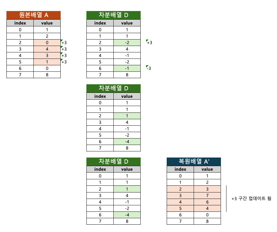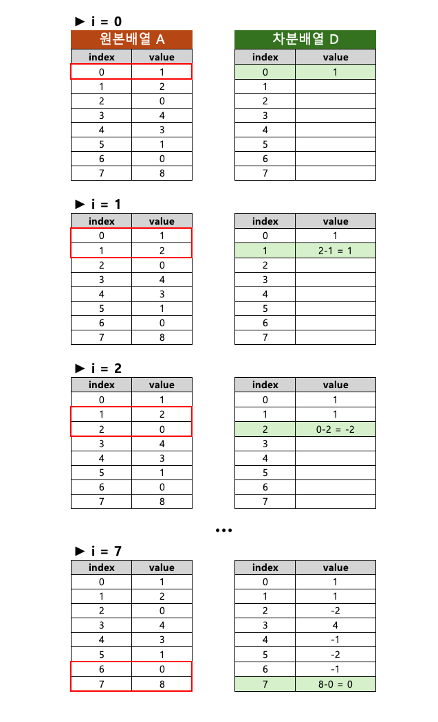- 차분배열의 각 요소는 원본배열의 현재 요소와 이전 요소의 차이를 저장하는 배열이다.