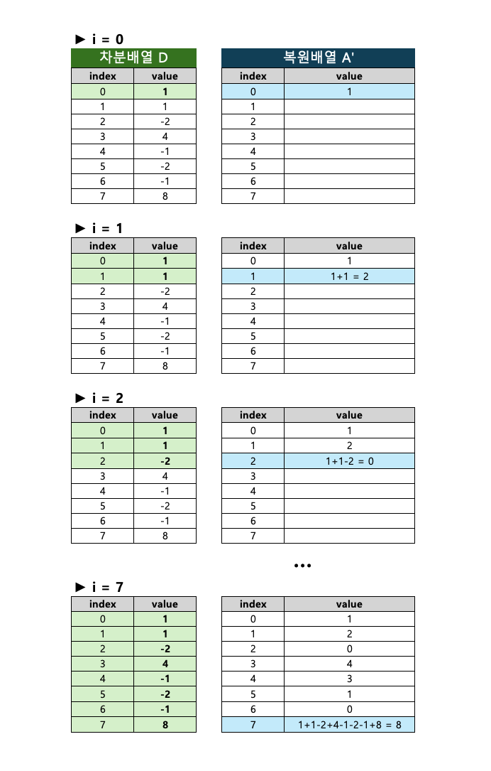 - 앞에서부터 누적합(Prefix Sum)을 구하면 다시 원본 배열 $A$ 를 복원할 수 있다.