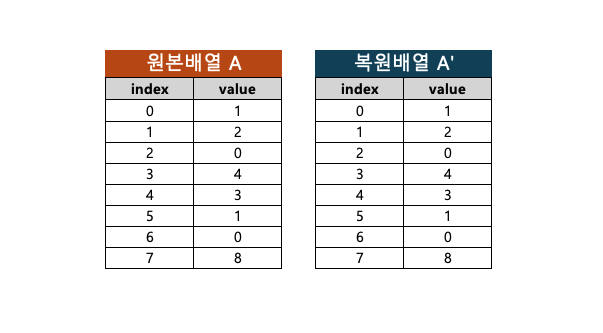 - 원본 배열과 복원 배열 비교