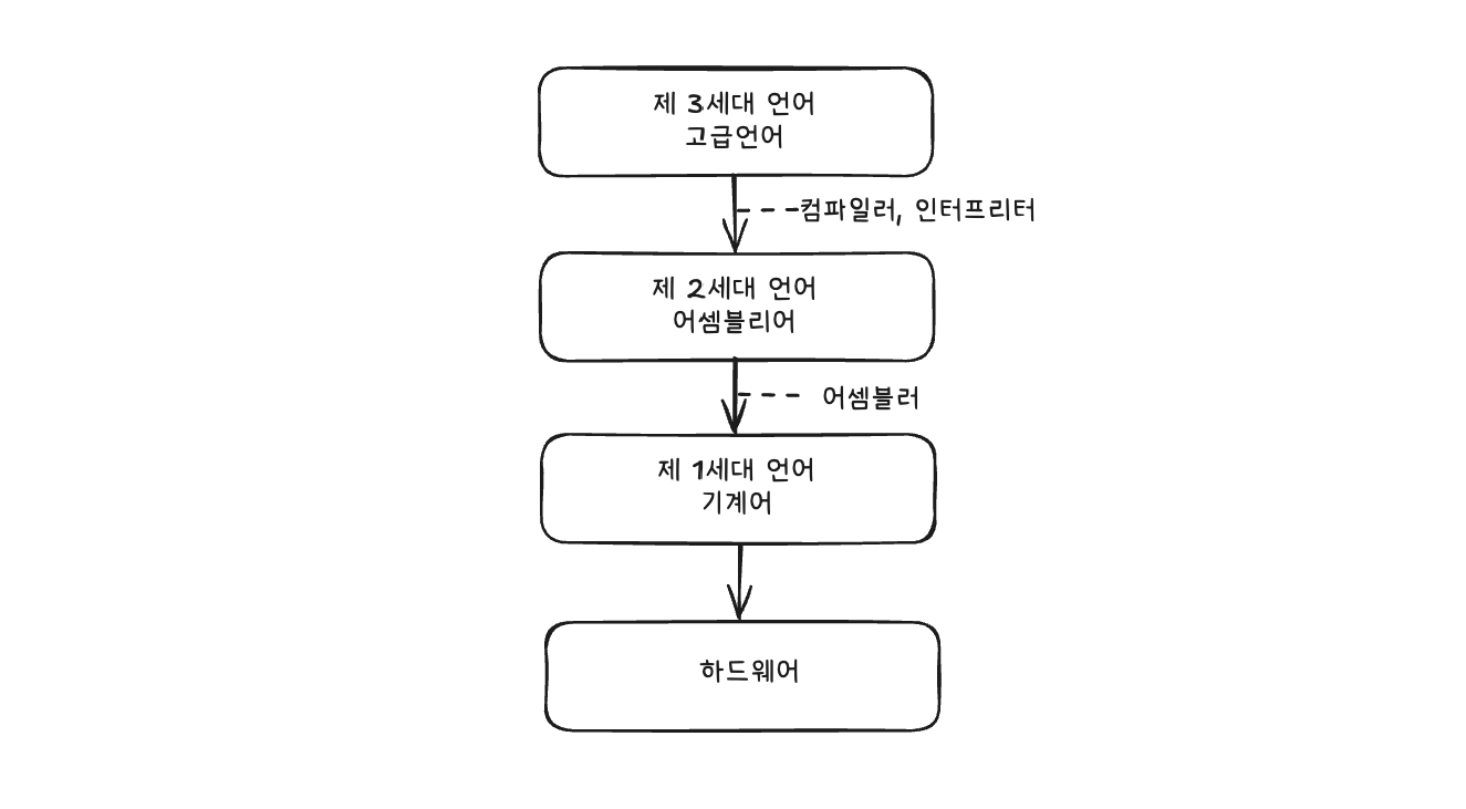 - 고급 언어로 작성된 프로그램은 컴파일러, 인터프리터에 의해 어셈블리어로 번역된다.