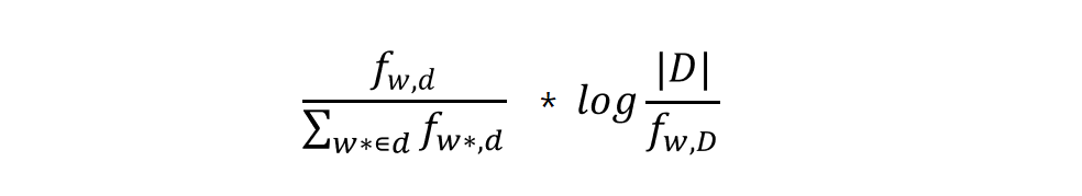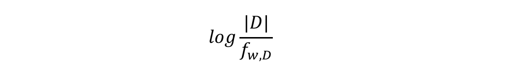 IDF(w): 단어 w가 전체 문서 집합(corpus) D에서 얼마나 희귀하게 나타나는지의 정도|D|: corpus 안의 전체 문서의 개수f(w,D): corpus 안에서 단어 w를 포함하는 문서의 개수- 희귀한 단어일수록 값이 높아져 중요도가 올라간다.