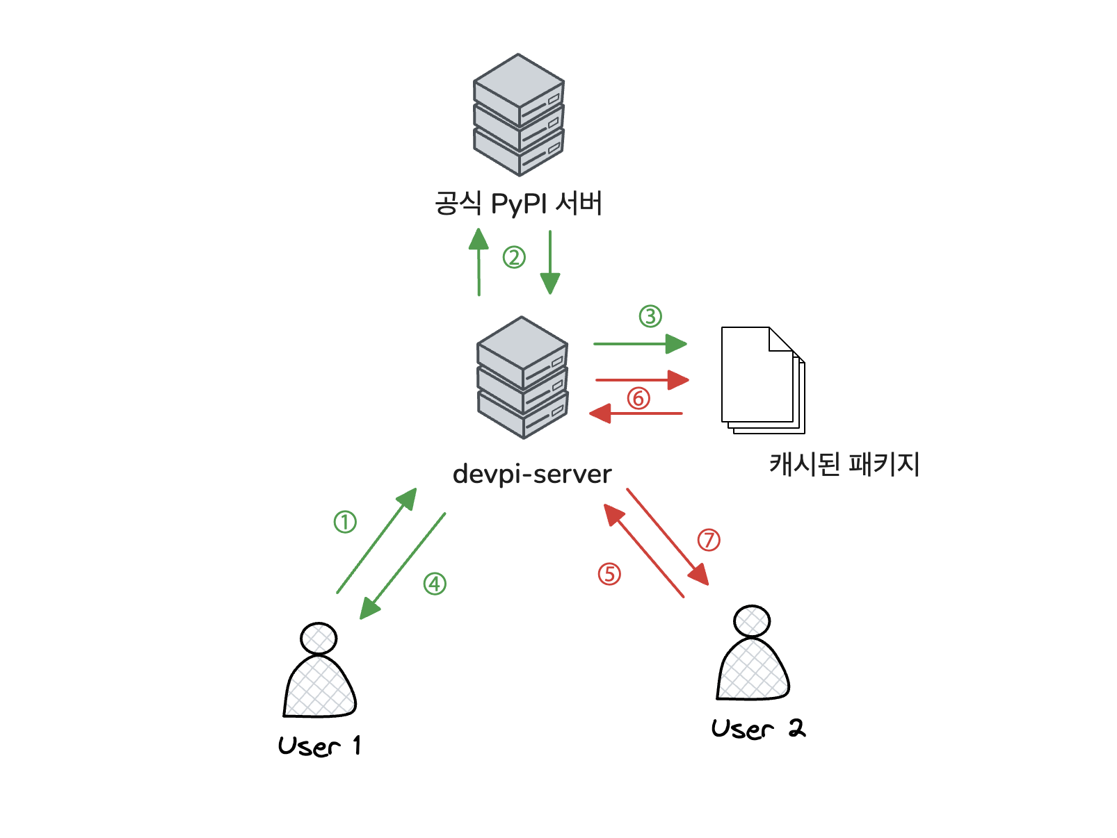 이번 섹션에서는 패키지 캐싱을 위해 devpi-server로 패키지 설치 요청을 보내는 방법을 소개해본다. (아래 도식에서 1번 단계에 해당)