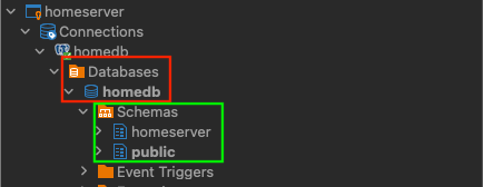 (빨간 색 네모 부분이 데이터베이스, 초록색이 스키마)