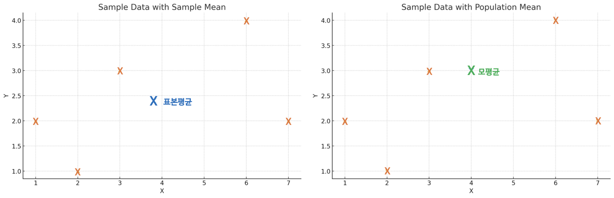표본인 경우를 살펴보자. 표본의 평균인 표본 평균은, 해당 데이터 집합에서 가장 중심에 있는 값이다. 따라서 데이터는 표본 평균을 중심으로 오차의 제곱합이 최소가 되도록 즉, 표본 평균을 중심으로 분산이 가장 작도록 펼쳐질 수밖에 없다. 표본 데이터 집합에서 표본 평균보다 더 작은 분산값을 갖게 하는 중심위치는 없는 것이다.